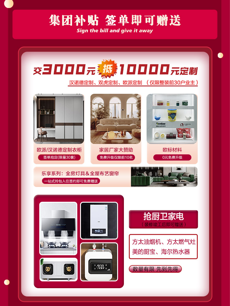 活動期間簽單客戶,交3000元抵10000元定制(僅限整裝前30戶)。